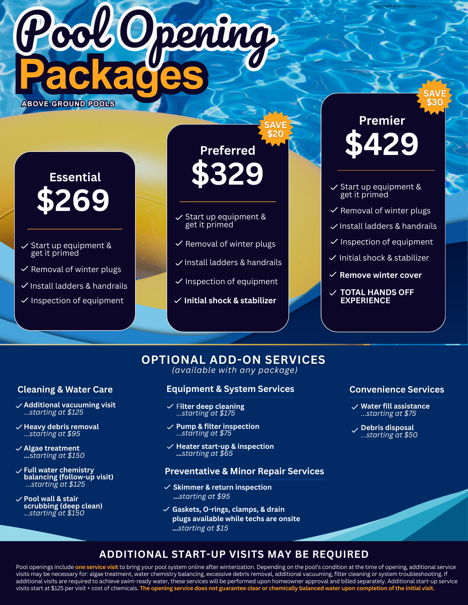Whether you're searching for above-ground pool opening services near you or looking for a trusted company to handle your seasonal startup, our experienced technicians ensure your pool system is safely started and ready for swimming.